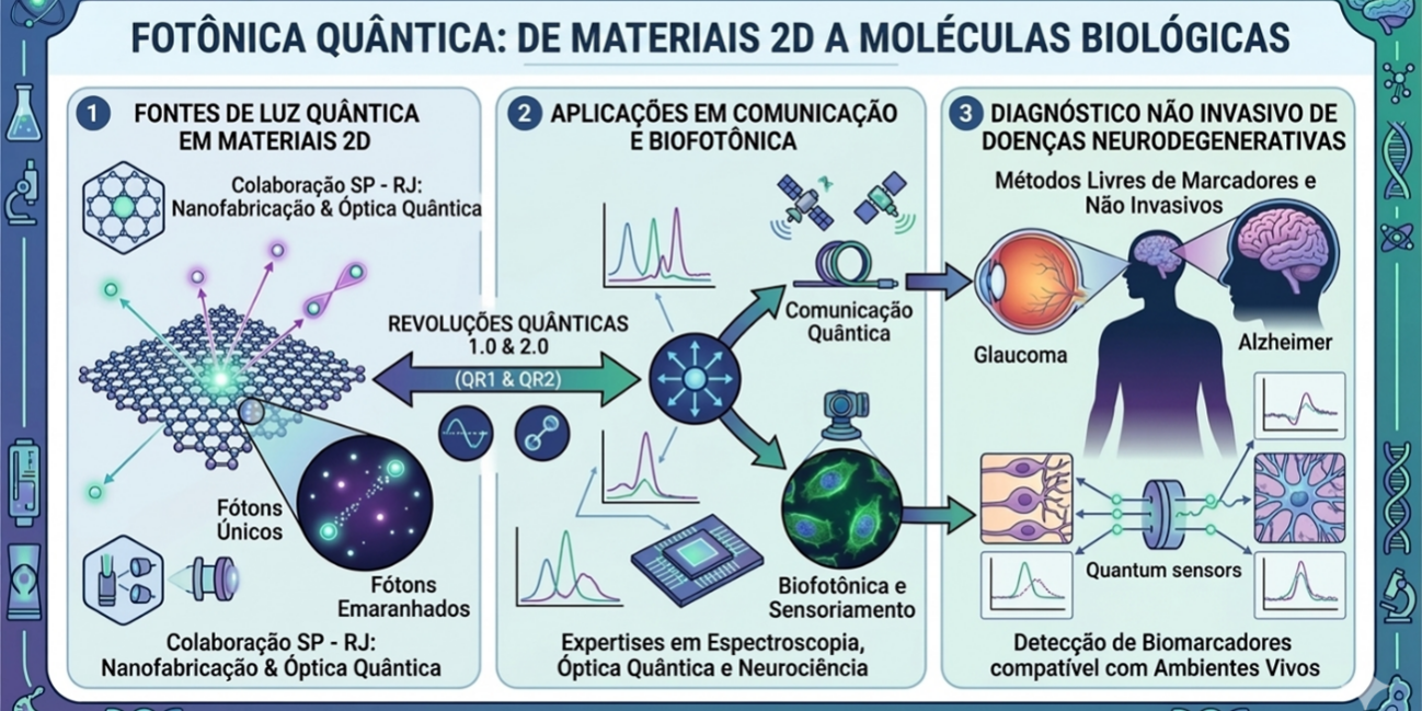O projeto investiga a interface entre a física quântica, materiais bidimensionais e sistemas biológicos, explorando fenômenos ópticos quânticos avançados para estabelecer novas bases em sensores, dispositivos fotônicos e métodos de diagnóstico em saúde. A combinação de fontes de fótons únicos, estados emaranhados e espectroscopia ultrassensível permitirá compreender tanto propriedades fundamentais de materiais 2D quanto comportamentos de biomoléculas relevantes para doenças neurodegenerativas e infecções virais.